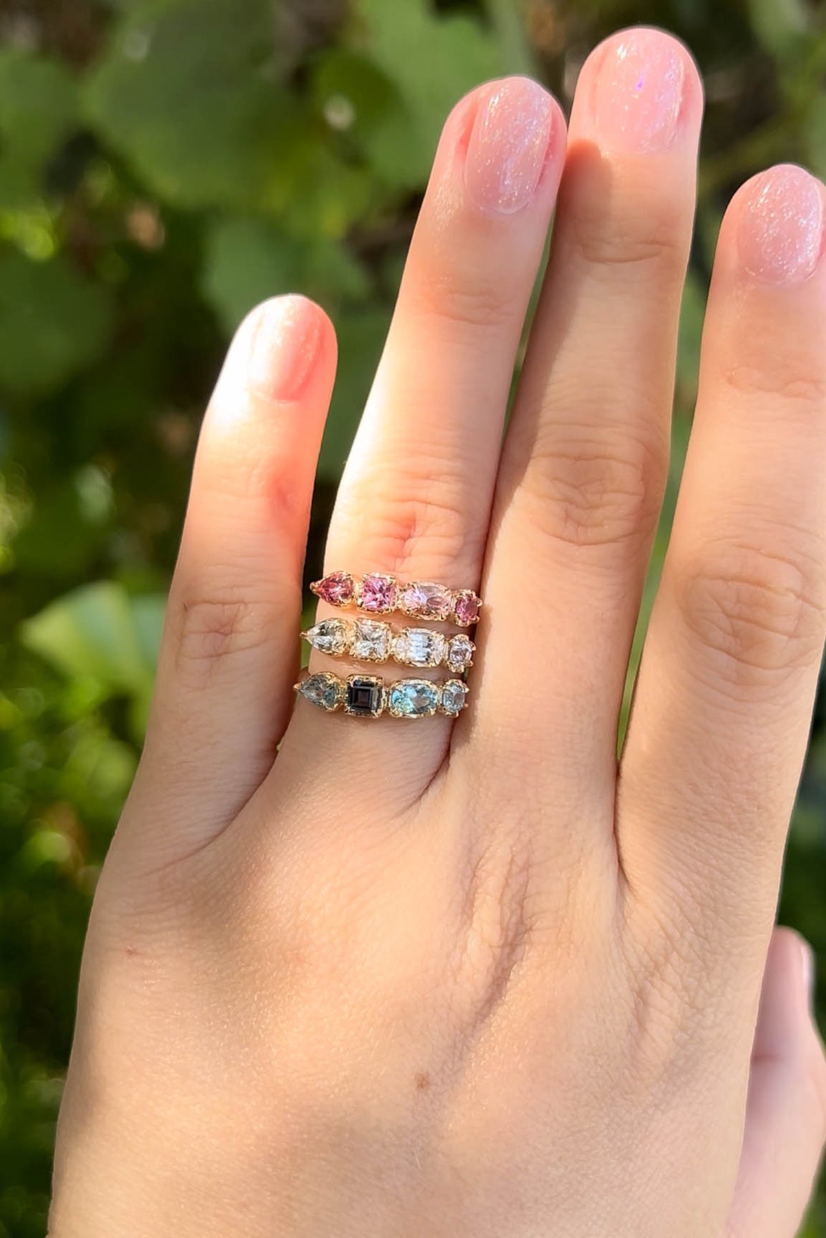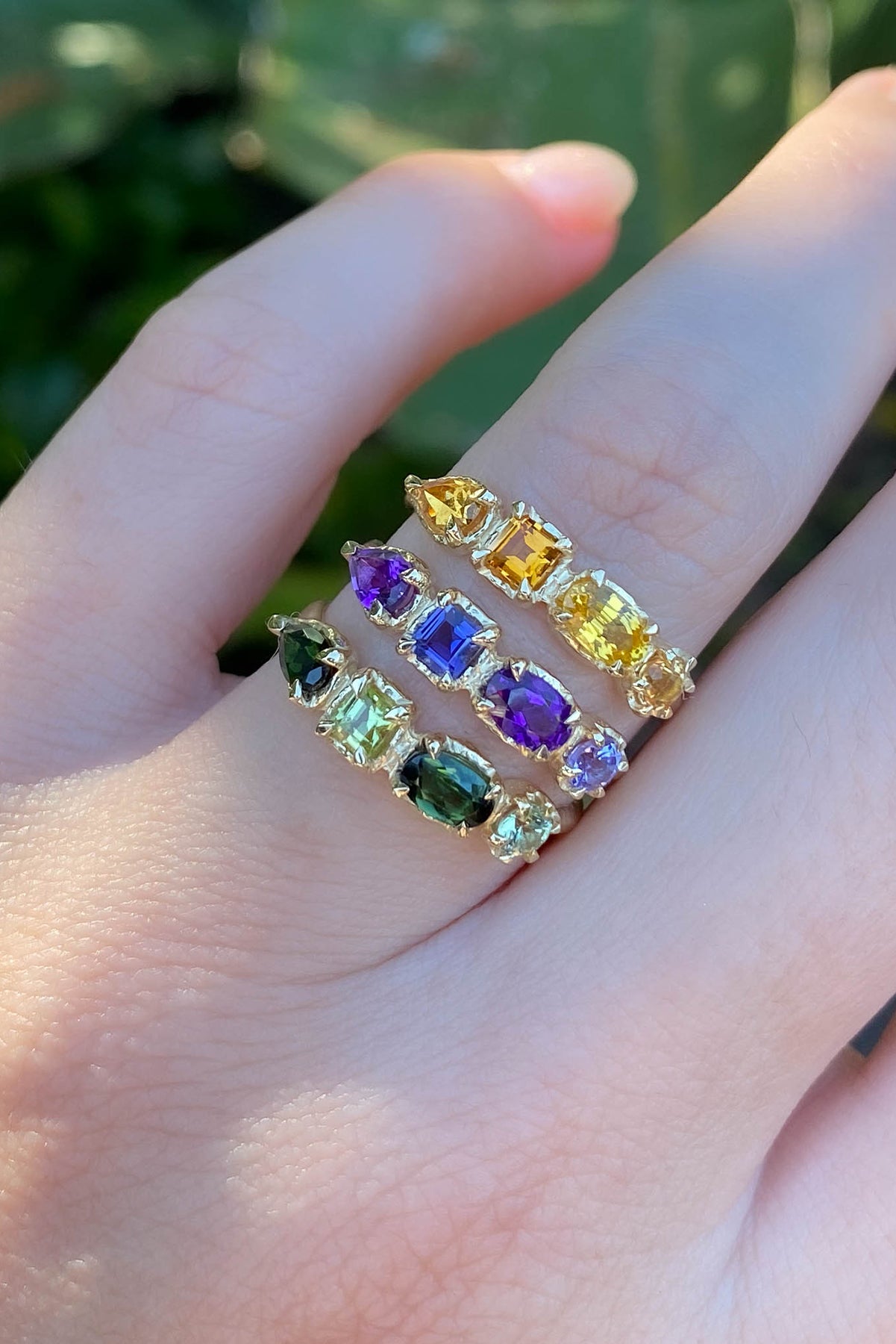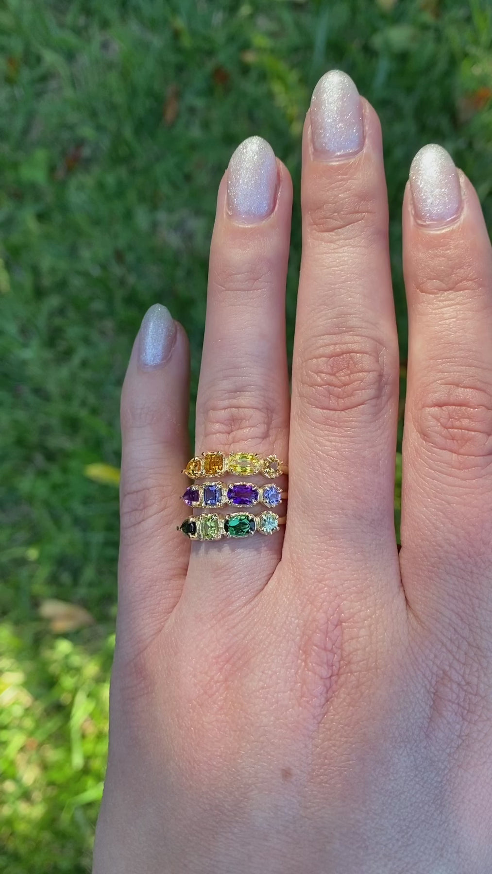 A unique twist on the classic three stone, past, present, and future ring, this beautiful gold ring would make a perfect engagement ring or a fun, treat yourself, just because ring!