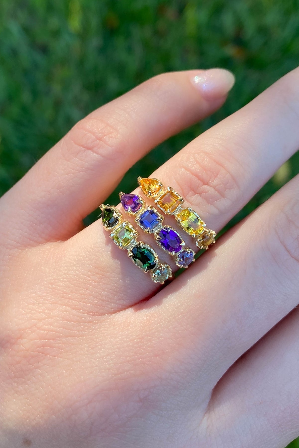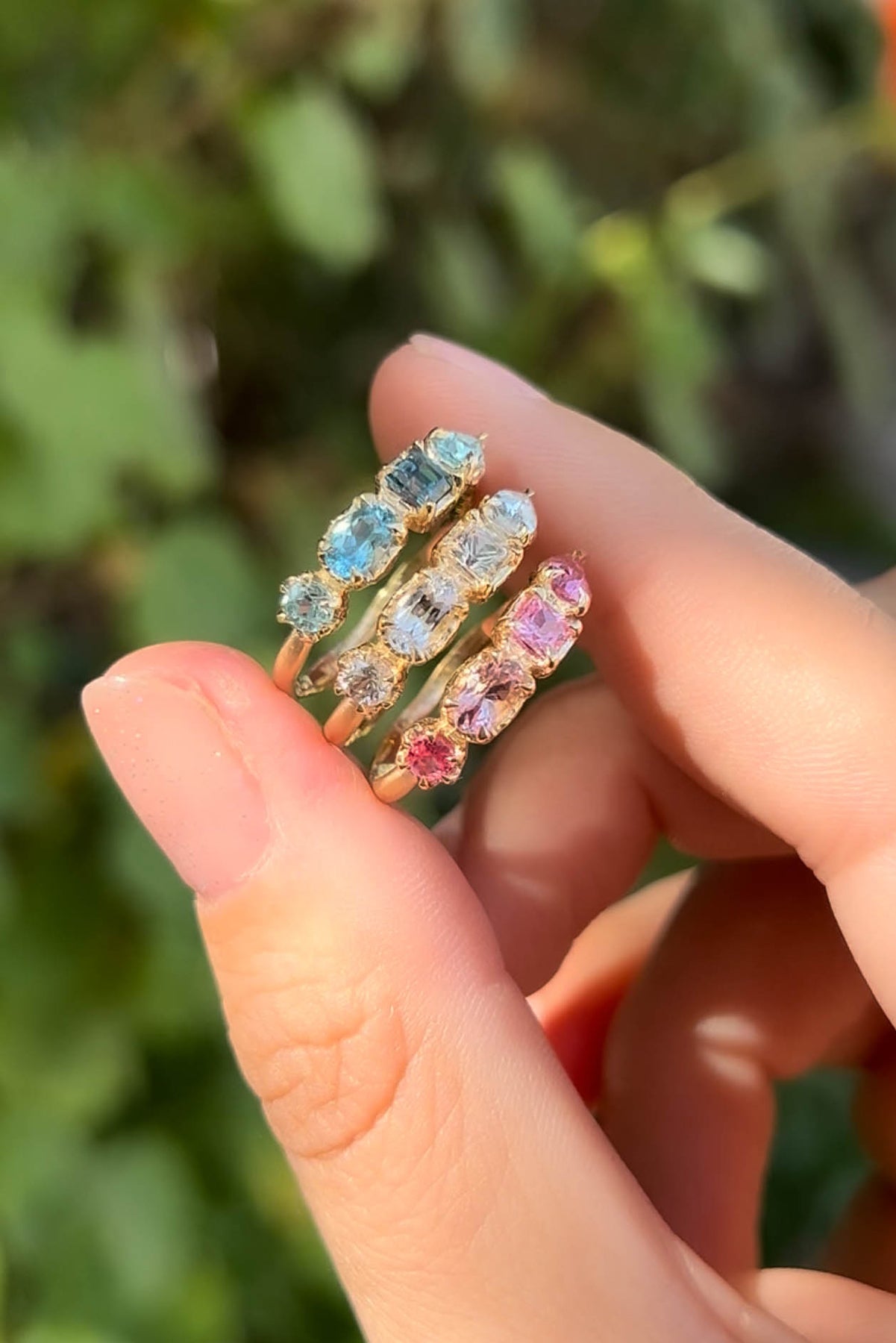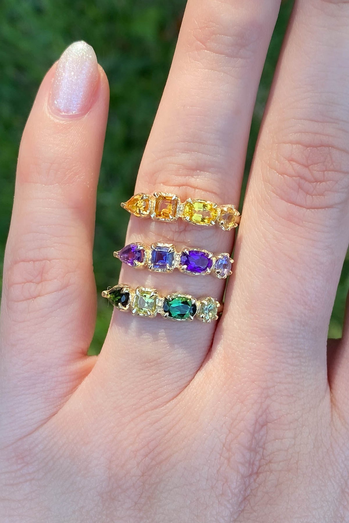 A unique twist on the classic three stone, past, present, and future ring, this beautiful gold ring would make a perfect engagement ring or a fun, treat yourself, just because ring!