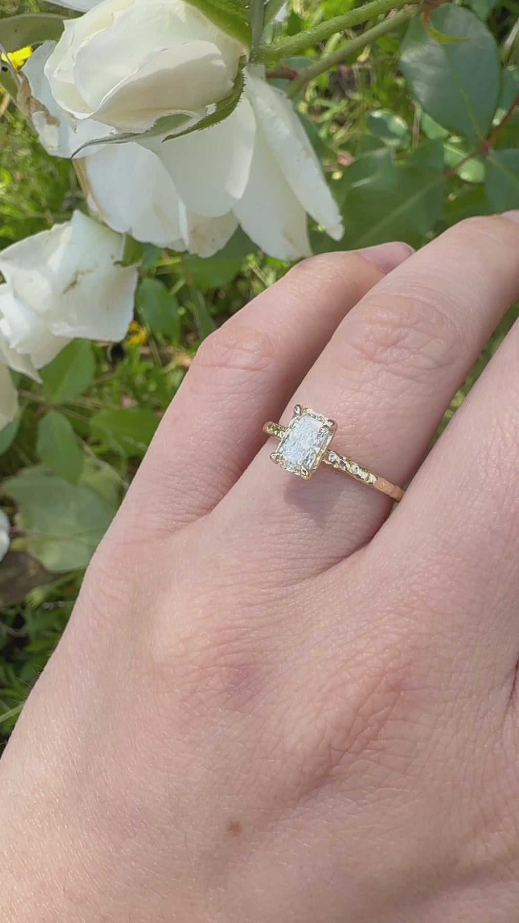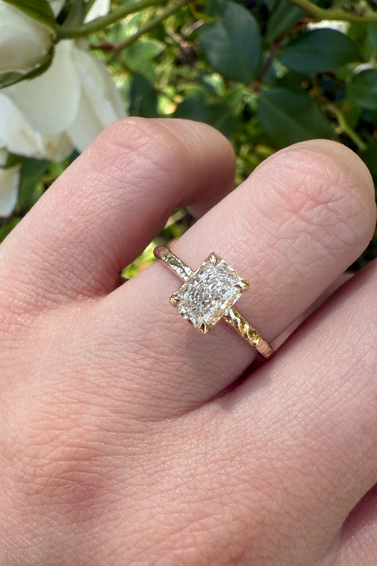 Timeless with a twist! Our stunning Drift ring features a classic engagement ring silhouette, made unique with a one-of-a-kind, hand-textured finish. A radiant cut stone sparkles in this feminine solitaire ring that gives off an authentic, natural vibe, reflecting the true feelings and passion in your love.